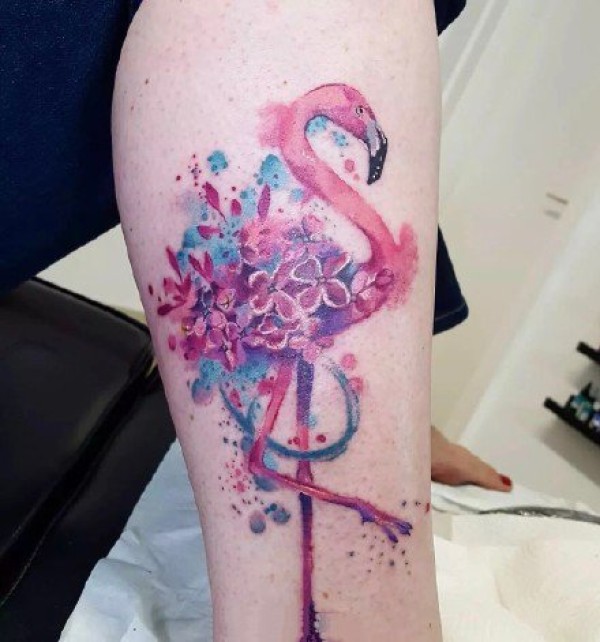 百乐动物纹身 女生小腿上彩色的火烈鸟纹身图片