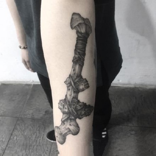 小臂上的匕首和器具黑灰点刺纹身图案欣赏