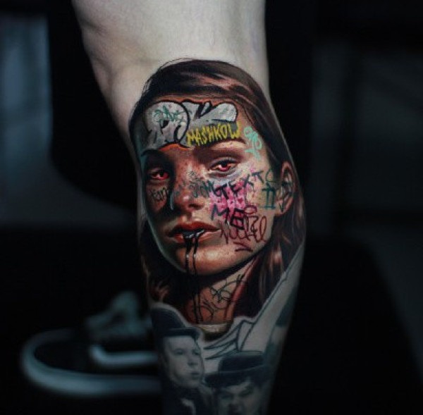 另类风格的彩色写实女性人像纹身图案作品