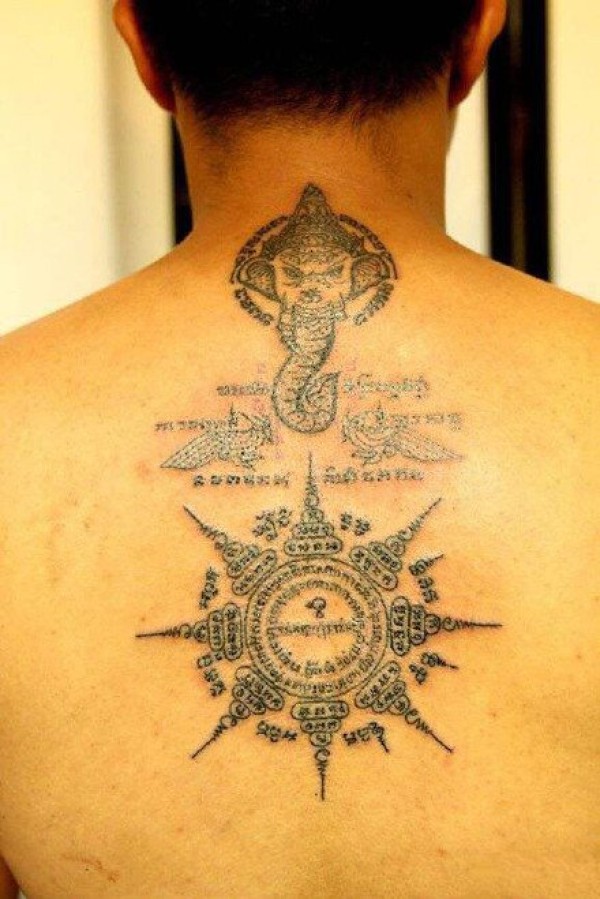 男士背部经文象神纹身图案