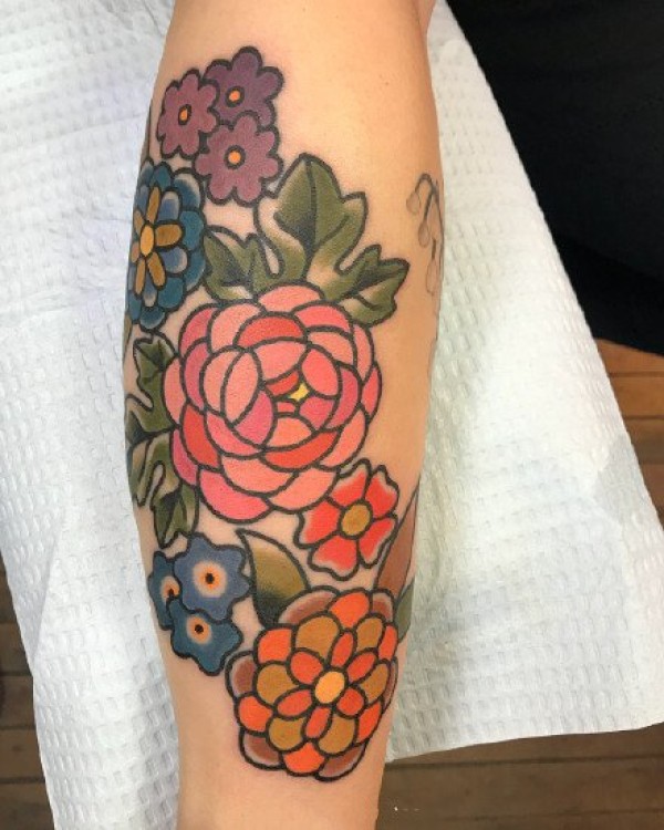 纹在手臂胳膊上的黑灰素花花卉纹身图案欣赏