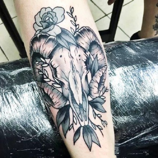 男人腿部经典时尚的羊头纹身图案