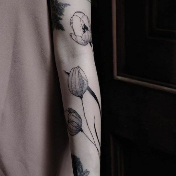 手臂和腿部上的简约长线条花卉纹身欣赏