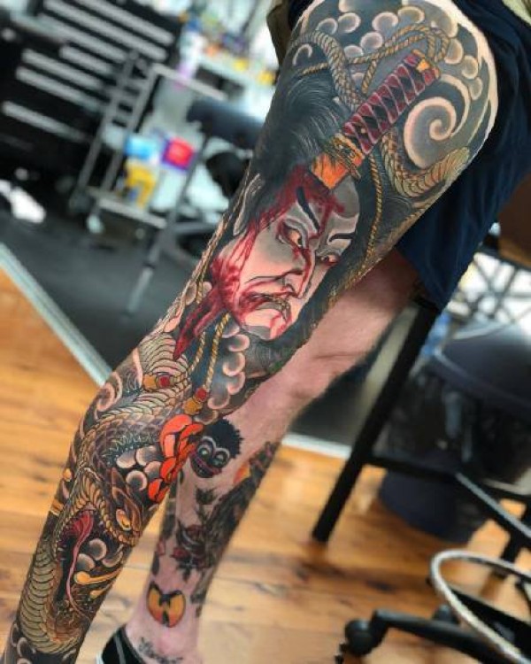 传统风格的一组男性花臂和花腿纹身图案欣赏