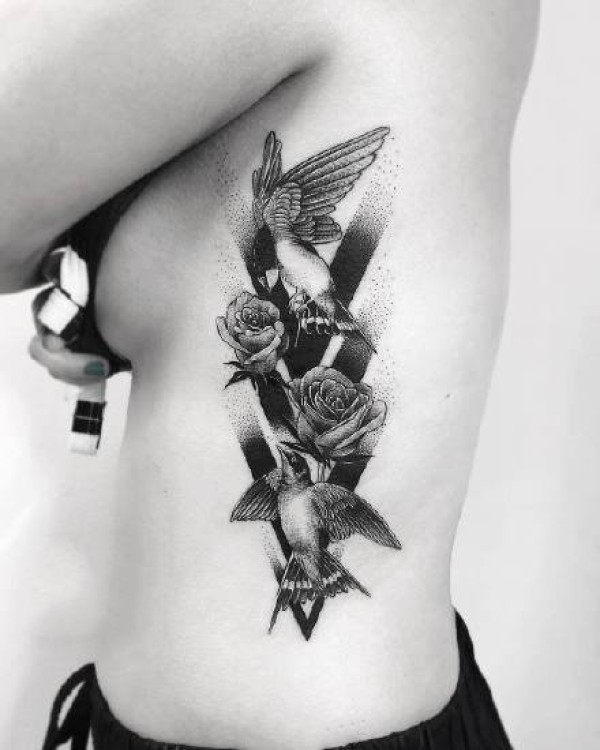 女生后腰纹身黑白灰风格抽象线条纹身图案