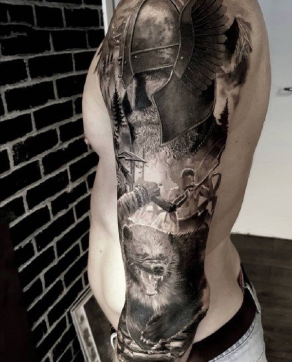 欧美花臂纹身_22张霸气黑灰欧美大黑花臂纹身图案作品图片