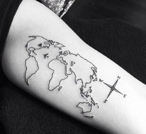 大臂纹身图 女生大臂上地图和指南针纹身图片