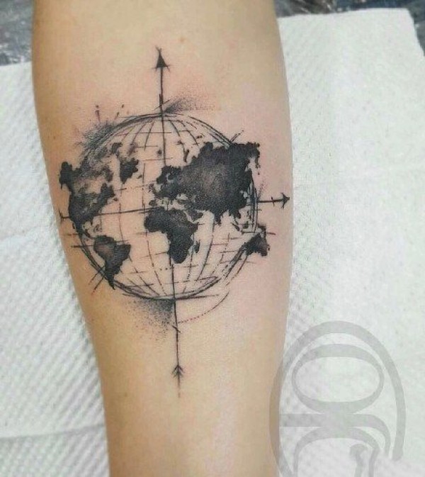 手臂内侧黑灰色地图和指南针纹身图片