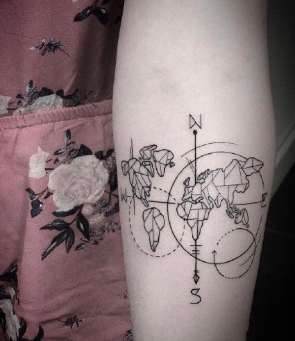 大臂纹身图 女生大臂上地图和指南针纹身图片