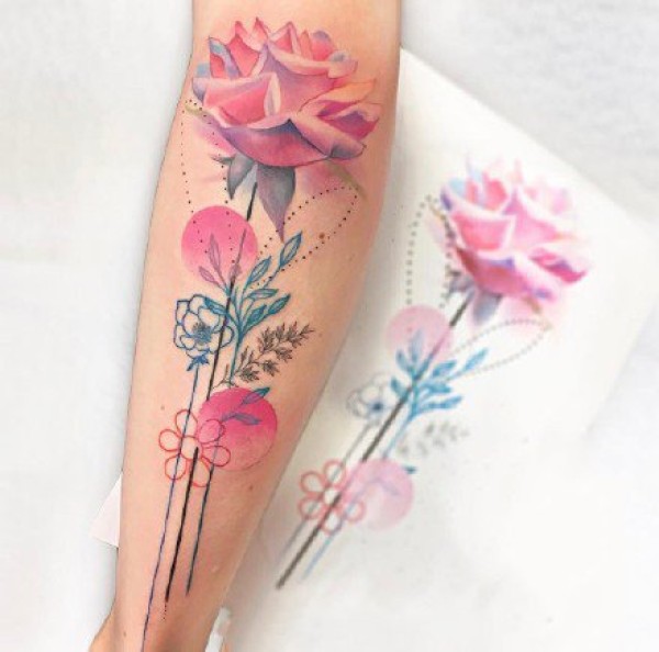 小臂上很好看的一组彩色花朵纹身图案9张