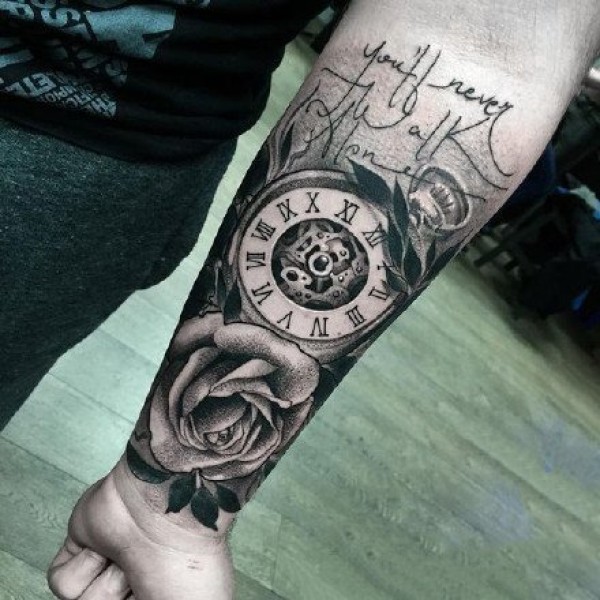 手臂胳膊上的欧美黑灰钟表玫瑰纹身图案9张