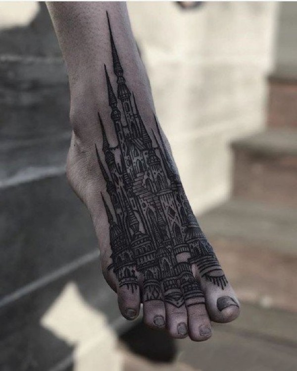 欧美大黑灰风格的城堡建筑系纹身作品