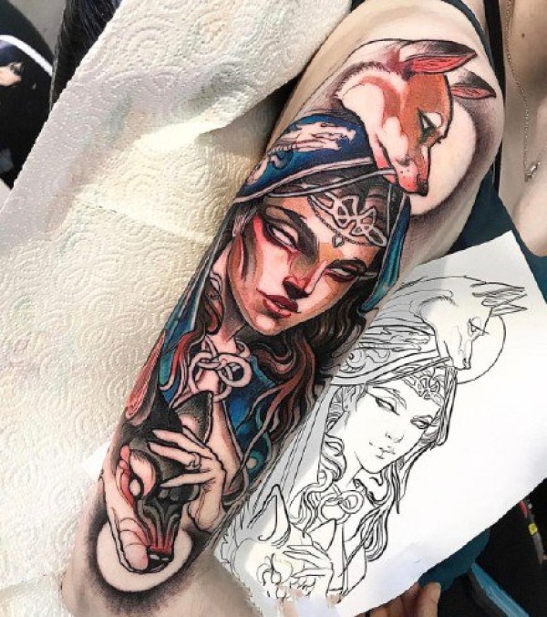 欧美女郎的彩色newschool女郎纹身作品图案