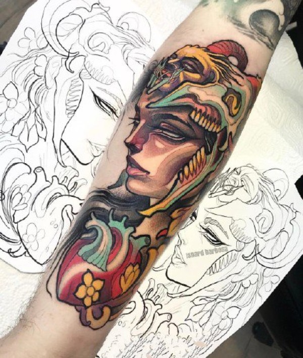 欧美女郎的彩色newschool女郎纹身作品图案