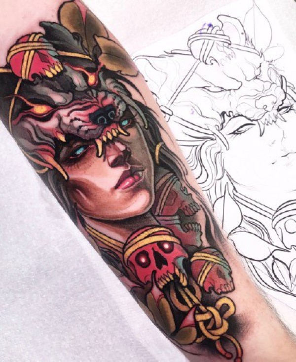 欧美女郎的彩色newschool女郎纹身作品图案
