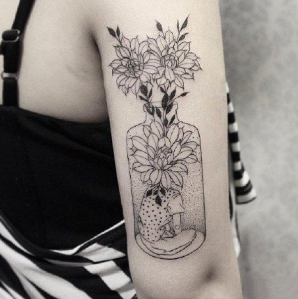 花朵在灯泡和瓶子里--黑色创意点刺花朵纹身图案作品