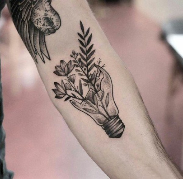 花朵在灯泡和瓶子里--黑色创意点刺花朵纹身图案作品