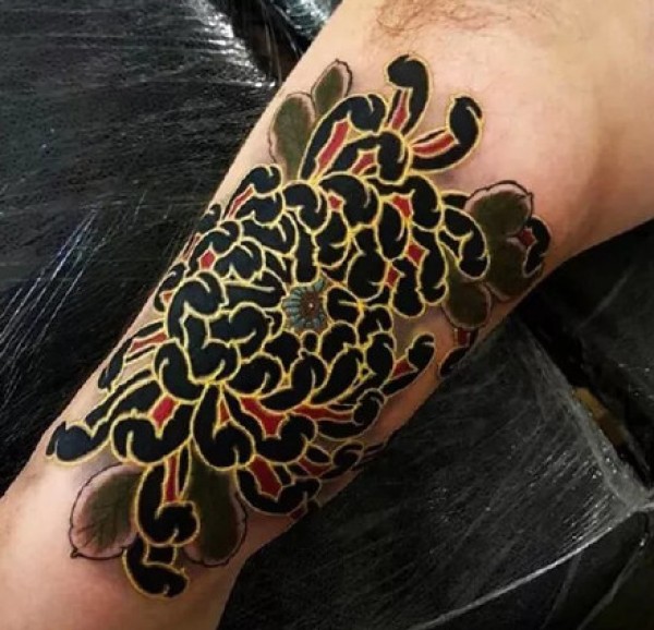 黑灰菊花:手臂和腿部上好看的黑灰菊花纹身图案