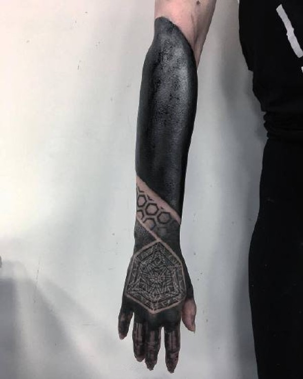 死黑手背纹身--从手臂到满手背的深黑色纹身图案