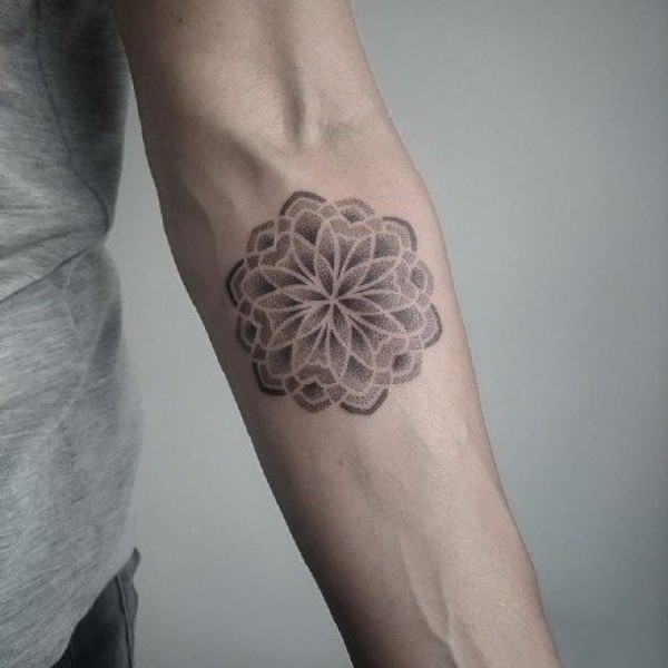 手臂上的点刺风格曼陀罗梵花纹身图案