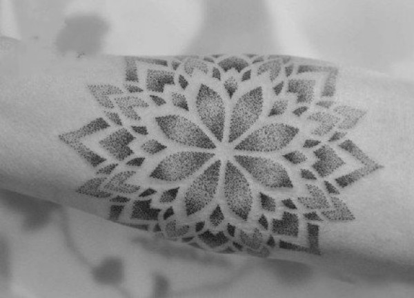 手臂上的点刺风格曼陀罗梵花纹身图案