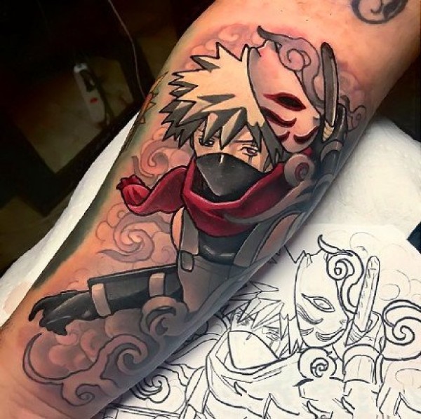 火影忍者纹身 男生手臂上面具和卡通人物纹身图片