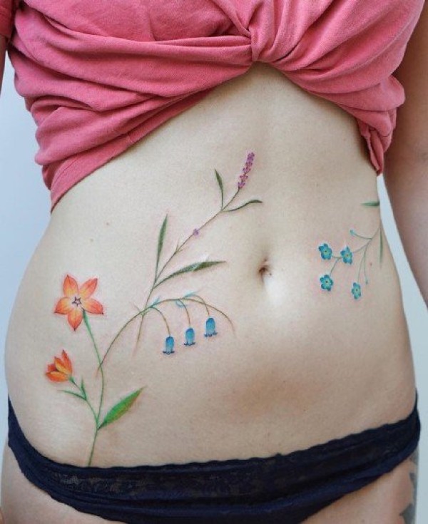 性感花朵纹身--女性大腿侧部性感的花朵纹身