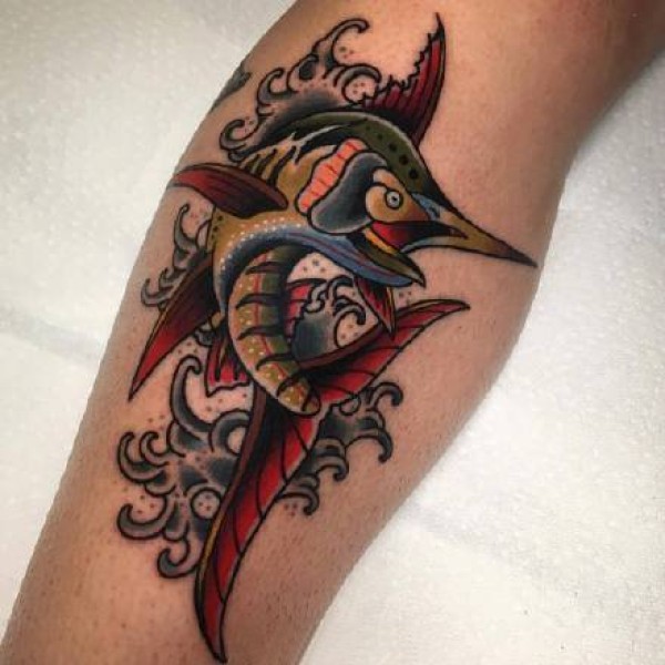小腿上的暗棕黑色的创意oldschool纹身作品图片