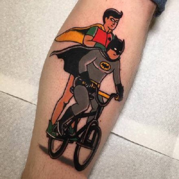 小腿上的暗棕黑色的创意oldschool纹身作品图片