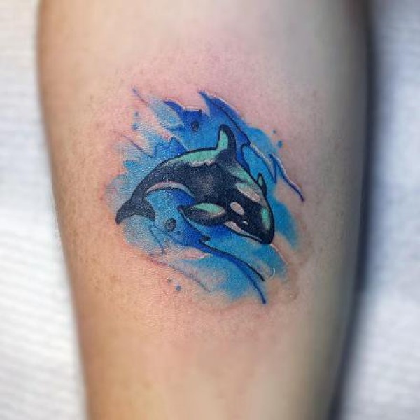后颈部蓝色马蹄莲和黑色满天星纹身
