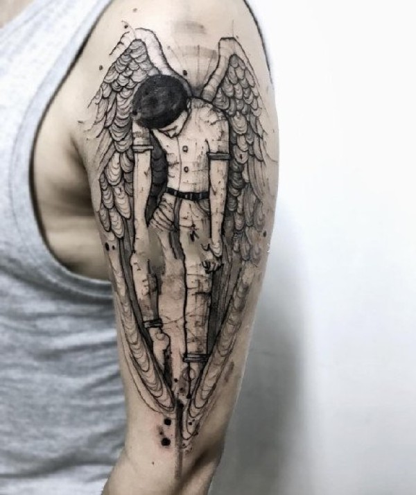男性大手臂上的一组个性黑灰纹身作品图案
