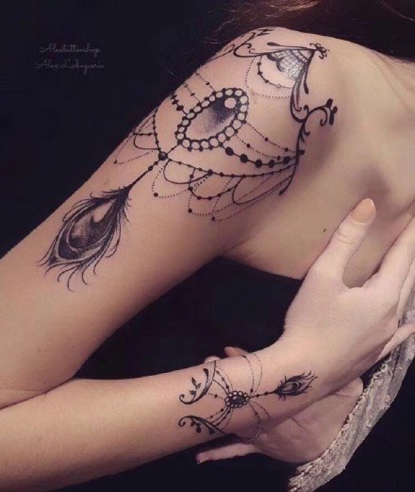 女生身上很性感的宝石蕾丝链纹身图案欣赏