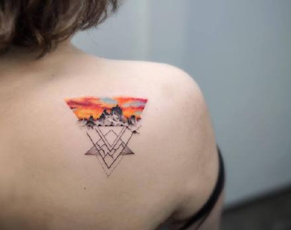 几何和水彩一起搭配的彩色纹身作品图案