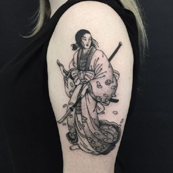 日本艺妓纹身图 黑灰或彩绘的日本艺妓包臂纹身图案