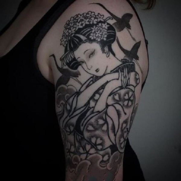 日本艺妓纹身图 黑灰或彩绘的日本艺妓包臂纹身图案
