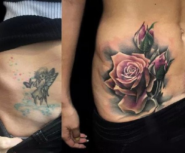 用玫瑰花做的修改遮盖纹身图案前后对比图