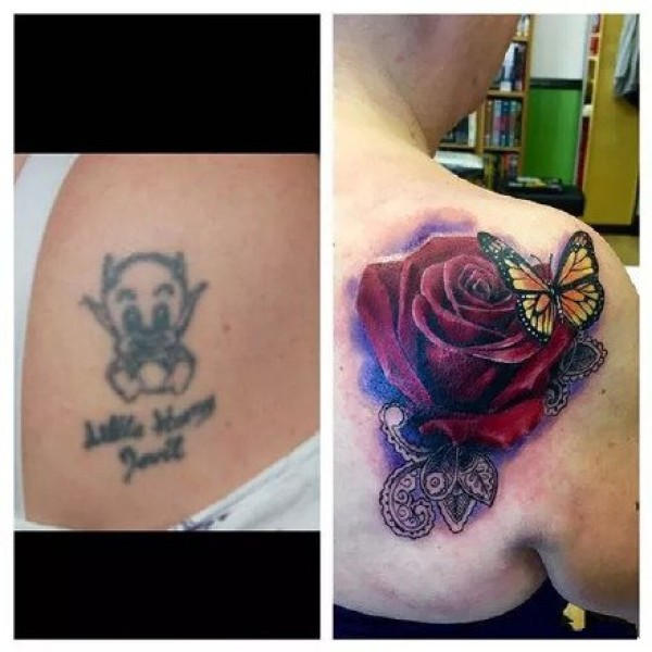 用玫瑰花做的修改遮盖纹身图案前后对比图