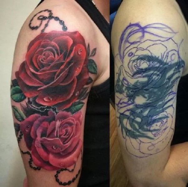 用玫瑰花做的修改遮盖纹身图案前后对比图