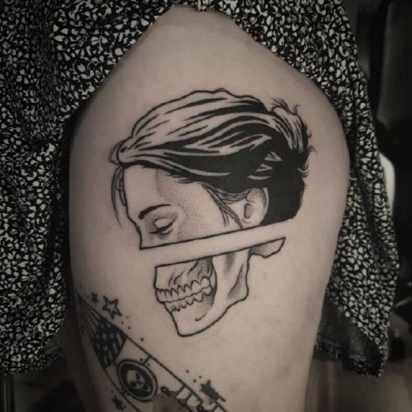 黑灰色半人脸半骷髅的一组个性半脸纹身图案9张