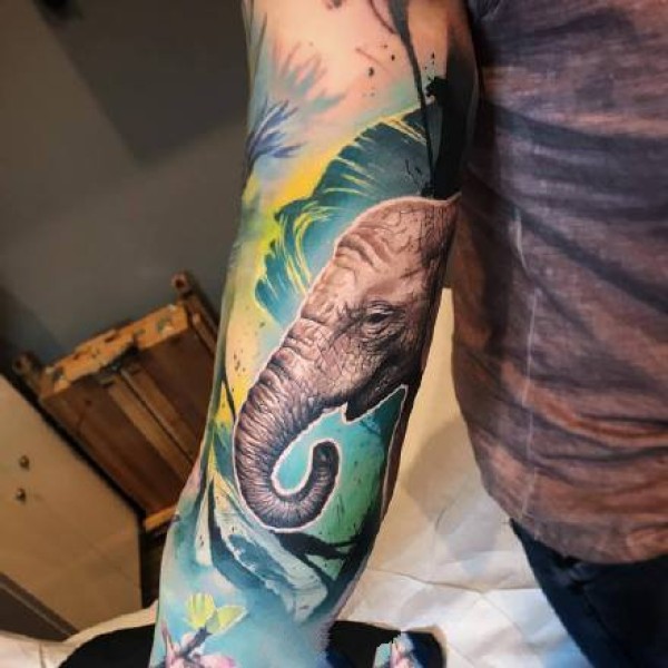写实的大象纹身,前足高高跃起