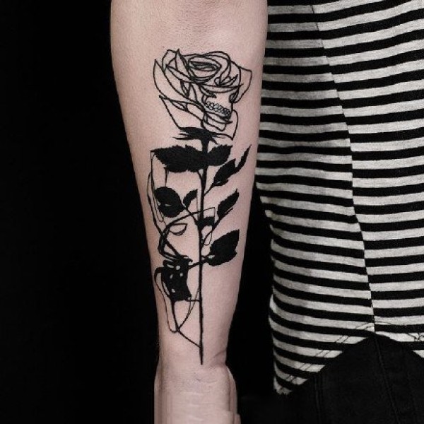 黑灰色玫瑰花和骷髅头纹身图片手稿