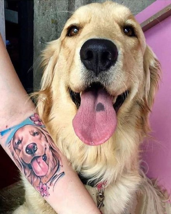 女生肩部彩色花猫咪玫瑰花纹身图案