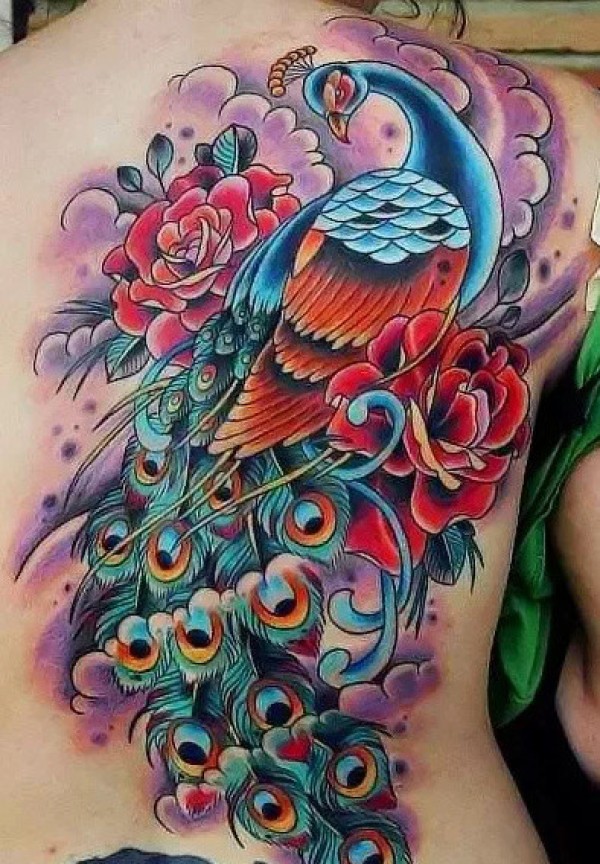 纹身图吧分享一张满背的彩色创意孔雀文身作品