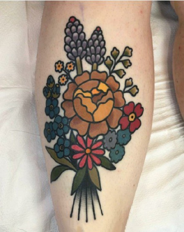 school风格的一组彩色花卉纹身图案9张
