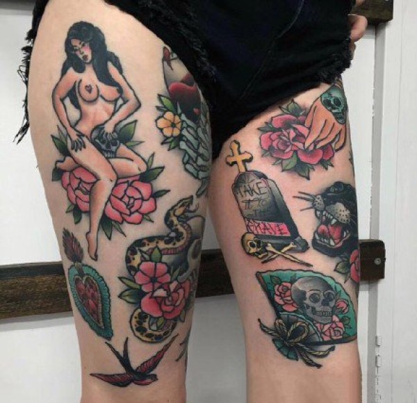传统风格的一组男性花臂和花腿纹身图案欣赏
