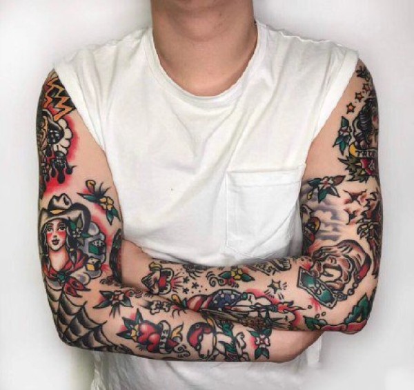oldschool风格的拼接花臂纹身作品欣赏