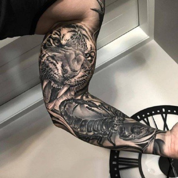 狮头虎头纹身 9组逼真的手臂包臂写实虎头和狮子头纹身图案