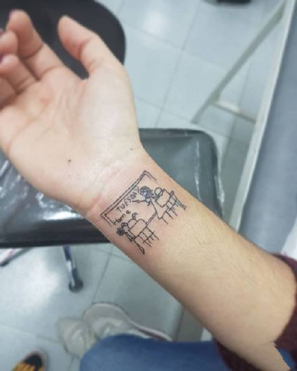 男生手臂上彩绘几何简单线条书籍和卡通人物纹身图片