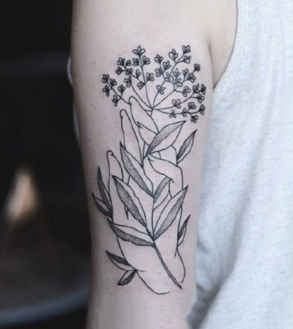 纹在手臂胳膊上的黑灰素花花卉纹身图案欣赏