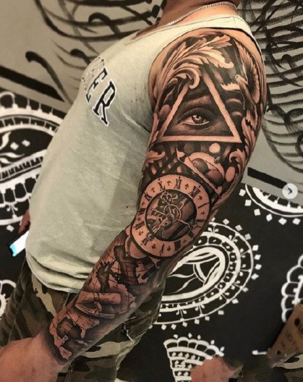 欧美花臂纹身_22张霸气黑灰欧美大黑花臂纹身图案作品图片
